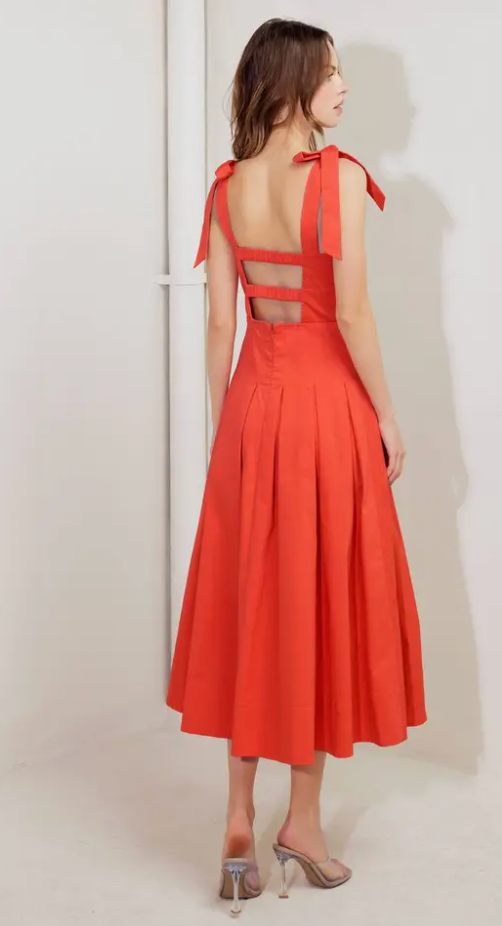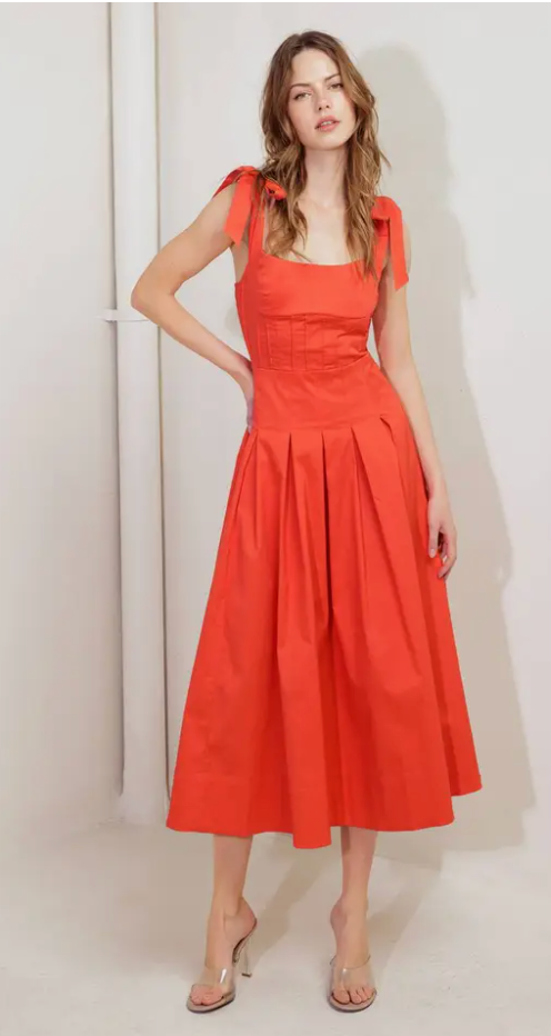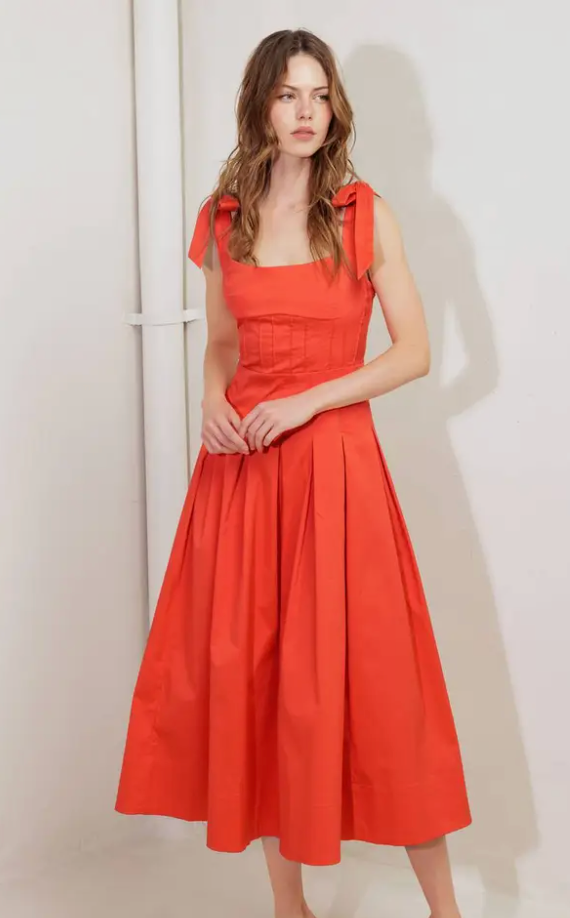 This midi dress is fitted through the bodice with a subtle corset-inspired panel, then flares out into a flowing, pleated skirt. The tie straps keep it playful (and adjustable), while the square neckline brings just enough structure. Perfect with cowboy boots in the stands or strappy heels for date night.