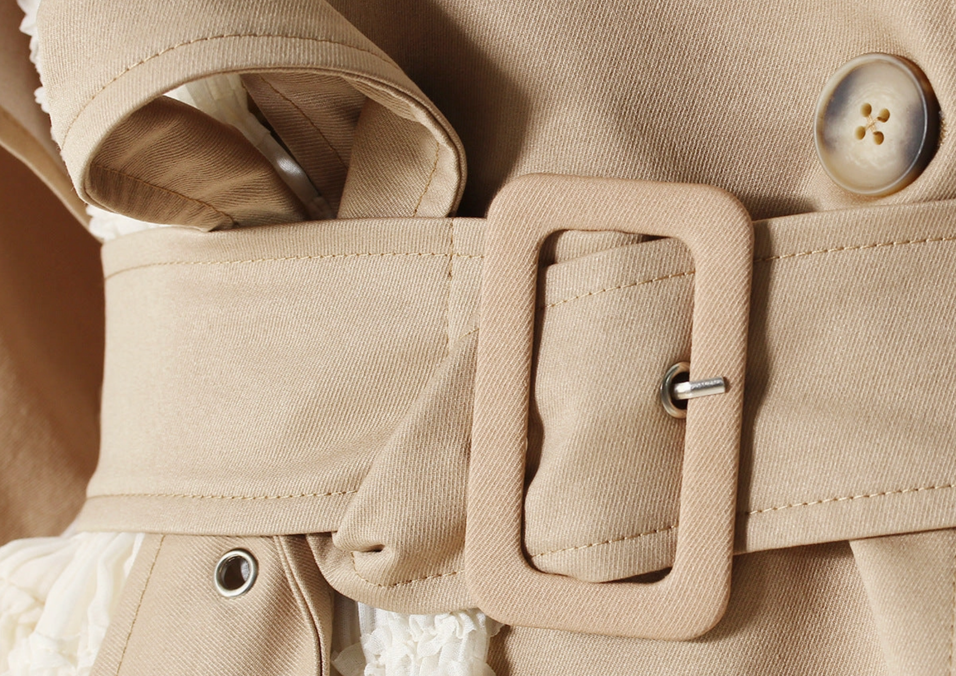 Graceful yet structured, this longline lace trench redefines elegance. Refined lace stitching and a sculpted silhouette accentuate the waist, while a wide tonal belt with metallic accents gives you shape. Double-breasted buttons, crisp lapels and delicately contoured cuffs add tailored sophistication. Pair it over dresses or with trousers—this coat transitions effortlessly from day to evening.
