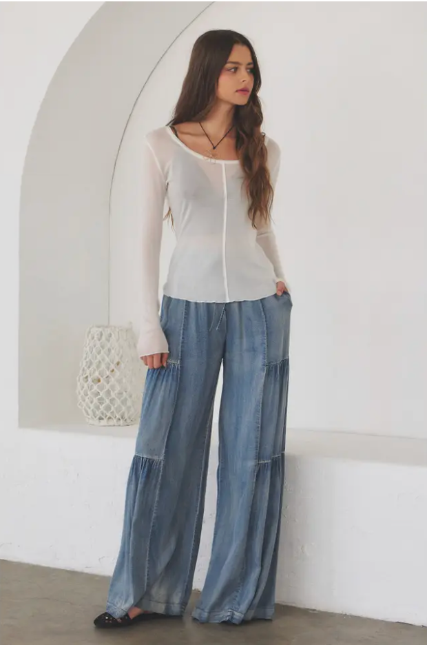 A lightweight long‑sleeve pullover with a relaxed fit and slightly sheer finish. The wide scoop neckline and drop shoulders make it easy to slip on and off, while the curved hem gives you styling options. Perfect over a cami or bralette on warm days, or layered under jackets when the breeze picks up.